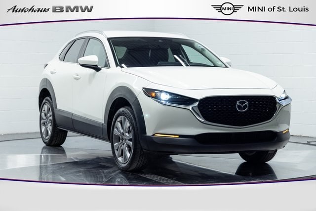 This Mazda CX-30 is well equipped with AppLink/Apple CarPlay and Android Auto, Auto High-beam Headlights, Exterior Parking Camera Rear, Heated front seats, Power driver seat, Rain sensing wipers, Remote keyless entry, 4-Wheel Disc Brakes, 4.095 Axle Ratio, 8 Speakers, ABS brakes, Air Conditioning, Alloy wheels, AM/FM radio, Automatic temperature control, Brake assist, Bumpers: body-color, Cargo Tray, Compass, Delay-off headlights, Driver door bin, Driver vanity mirror, Dual front impact airbags, Dual front side impact airbags, Electronic Stability Control, Emergency communication system: Mazda Connected Services (3-year complimentary trial included), Front anti-roll bar, Front Bucket Seats, Front Center Armrest, Front dual zone A/C w/pollen filter, Front reading lights, Front wheel independent suspension, Fully automatic headlights, Heated Front Bucket Seats, Illuminated entry, Knee airbag, Leather Shift Knob, Leather steering wheel, Leatherette Seat Trim, Low tire pressure warning, MAZDA CONNECT Infotainment System, Memory seat, Moon Roof Credit, Occupant sensing airbag, Outside temperature display, Overhead airbag, Overhead console, Panic alarm, Passenger door bin, Passenger vanity mirror, Power door mirrors, Power steering, Power windows, Radio data system, Radio: AM/FM/HD Audio System, Rear seat center armrest, Rear side impact airbag, Rear window defroster, Rear window wiper, Snowflake White Pearl Mica Paint, Speed control, Speed-sensing steering, Split folding rear seat, Spoiler, Steering wheel mounted audio controls, Tachometer, Telescoping steering wheel, Tilt steering wheel, Traction control, Trip computer, Turn signal indicator mirrors, Variably intermittent wipers, Wheel Locks, and Wheels: 18" x 7J Aluminum Alloy.