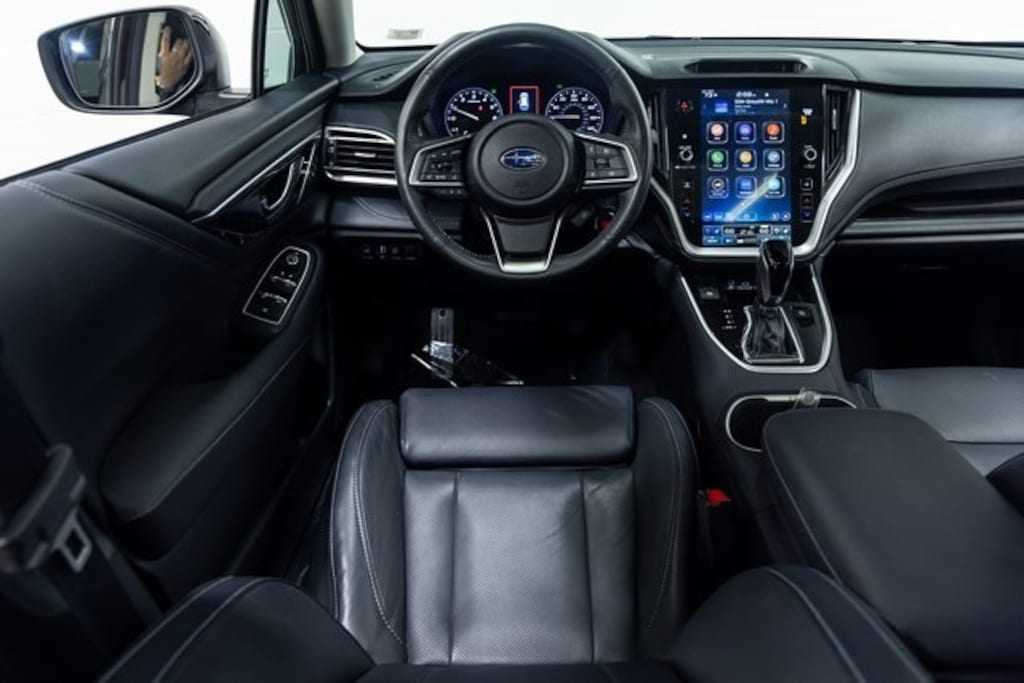 This Outback is well equipped with Standard Model, harman/kardon® Speakers, Heated & Ventilated Front Bucket Seats, Heated steering wheel, Memory seat, Power driver seat, Power moonroof, Remote keyless entry, 12 Speakers, 4-Wheel Disc Brakes, 4.111 Axle Ratio, ABS brakes, Air Conditioning, Alloy wheels, AM/FM radio: SiriusXM, Auto High-beam Headlights, Auto-Dimming Exterior Mirror w/Approach Light, Auto-dimming Rear-View mirror, Automatic temperature control, Brake assist, Bumpers: body-color, Cargo Sidewall Protector, Compass, Driver door bin, Driver vanity mirror, Dual front impact airbags, Dual front side impact airbags, Electronic Stability Control, Emergency communication system: STARLINK Safety Plus (3-year free trial), Exterior Parking Camera Rear, Four wheel independent suspension, Front anti-roll bar, Front Bucket Seats, Front Center Armrest w/Storage, Front dual zone A/C w/pollen filter, Front fog lights, Front reading lights, Fully automatic headlights, Garage door transmitter: HomeLink, Heated door mirrors, Heated front seats, Heated rear seats, HVAC memory, Illuminated entry, Knee airbag, Leather Shift Knob, Leather steering wheel, Low tire pressure warning, Navigation System w/6.5 touchscreen, Occupant sensing airbag, Outside temperature display, Overhead airbag, Overhead console, Panic alarm, Passenger door bin, Passenger vanity mirror, Perforated Nappa Leather-Trimmed Upholstery, Power door mirrors, Power Liftgate, Power passenger seat, Power steering, Power windows, Radio: Subaru STARLINK 11.6" Multimedia Nav System, Rear anti-roll bar, Rear Seat Back Protector, Rear seat center armrest, Rear window defroster, Rear window wiper, Remote CD player, Roof rack, Security system, Speed control, Speed-sensing steering, Splash Guards, Split folding rear seat, Spoiler, Steering wheel mounted audio controls, Steering Wheel Paddle Shift Control Switches, Tachometer, Telescoping steering wheel, Tilt steering wheel, Traction control, Trip computer, Turn signal indicator mirrors, Variably intermittent wipers, Ventilated front seats, Wheels: 18" x 7J Black Aluminum Alloy, and Windshield Sunshade.