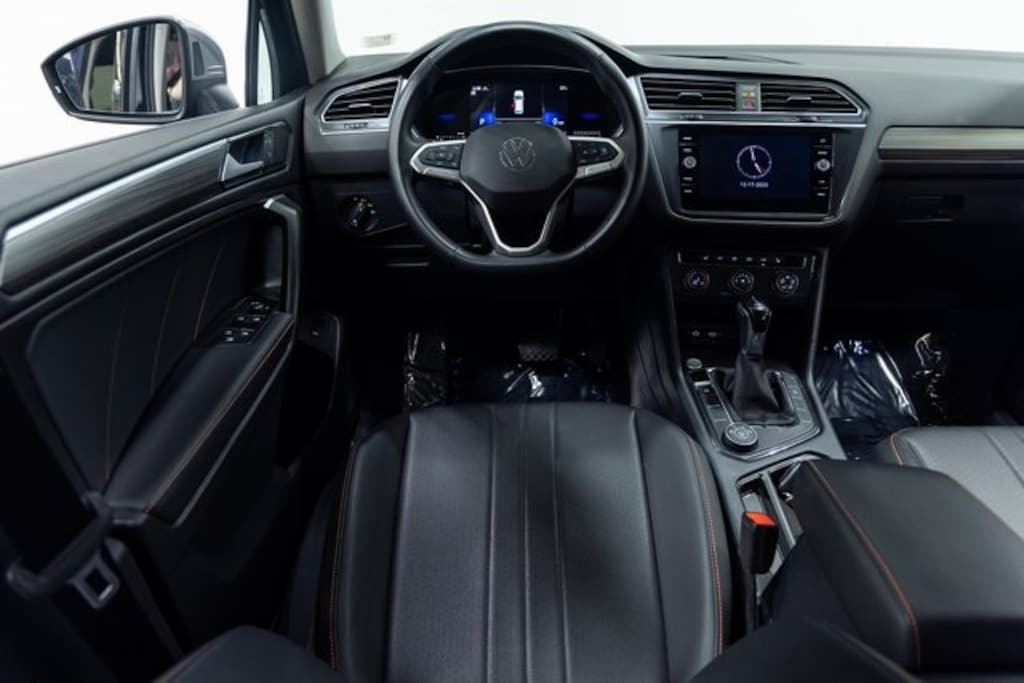 This Tiguan is well equipped with Active Cruise Control, Exterior Parking Camera Rear, Heated Front Seats, Illuminated entry, Power driver seat, Power Liftgate, Rain sensing wipers, Remote keyless entry, Steering wheel mounted audio controls, Wheels: 18" 2-Tone Machined Alloy, 3.33 Axle Ratio, 4-Wheel Disc Brakes, 4-Wheel Independent Suspension, 6 Speakers, ABS brakes, Air Conditioning, Alloy wheels, AM/FM radio: SiriusXM with 360L, Auto-dimming Rear-View mirror, Brake assist, Bumpers: body-color, Compass, Delay-off headlights, Driver door bin, Driver vanity mirror, Dual front impact airbags, Dual front side impact airbags, Electronic Stability Control, Emergency communication system: VW Car-Net Safe & Secure 5-year, Four wheel independent suspension, Front anti-roll bar, Front Bucket Seats, Front Center Armrest, Front reading lights, Fully automatic headlights, Heated door mirrors, Heated front seats, Leather Shift Knob, Low tire pressure warning, Occupant sensing airbag, Outside temperature display, Overhead airbag, Overhead console, Panic alarm, Passenger door bin, Passenger vanity mirror, Power door mirrors, Power steering, Power windows, Radio data system, Radio: MIB3 Composition Media AM/FM/HD, Rear anti-roll bar, Rear reading lights, Rear seat center armrest, Rear window defroster, Rear window wiper, Security system, Speed control, Speed-sensing steering, Split folding rear seat, Spoiler, Tachometer, Telescoping steering wheel, Tilt steering wheel, Traction control, Trip computer, Turn signal indicator mirrors, V-Tex Leatherette Seating Surfaces, and Variably intermittent wipers.